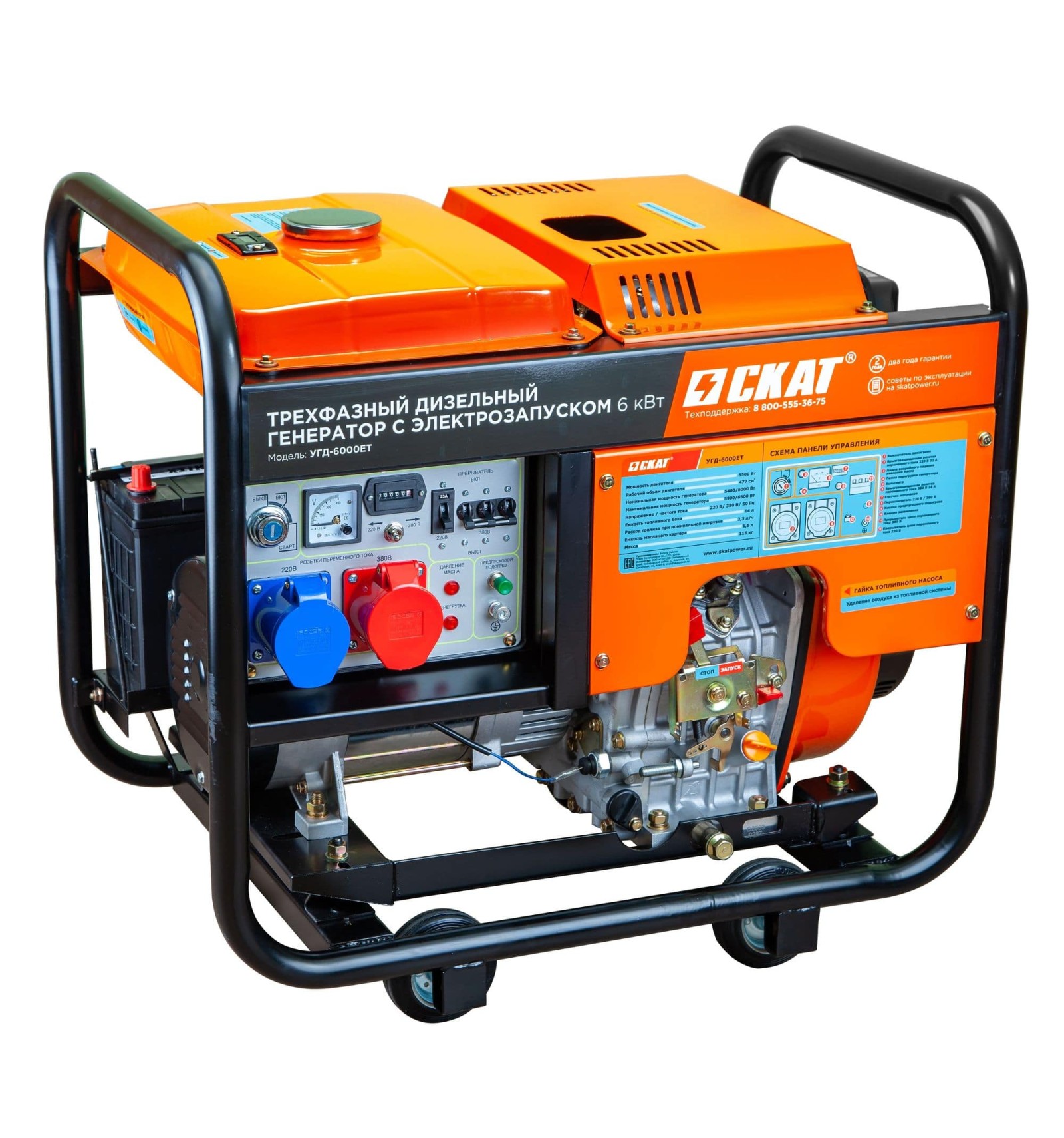Установка Генераторная Дизельная (УГД) общей мощностью 6000 ВА, Е - электростартер, Т - трехфазная. Электростанция выполнена на малообъемной раме и удобна для переноски или перемещения дизель-генератора с объекта на объект (стройплощадки, дачные дома и т. д.). Данный электроагрегат является резервным (аварийным) источником питания бытовых потребителей напряжением 220 и 380В.