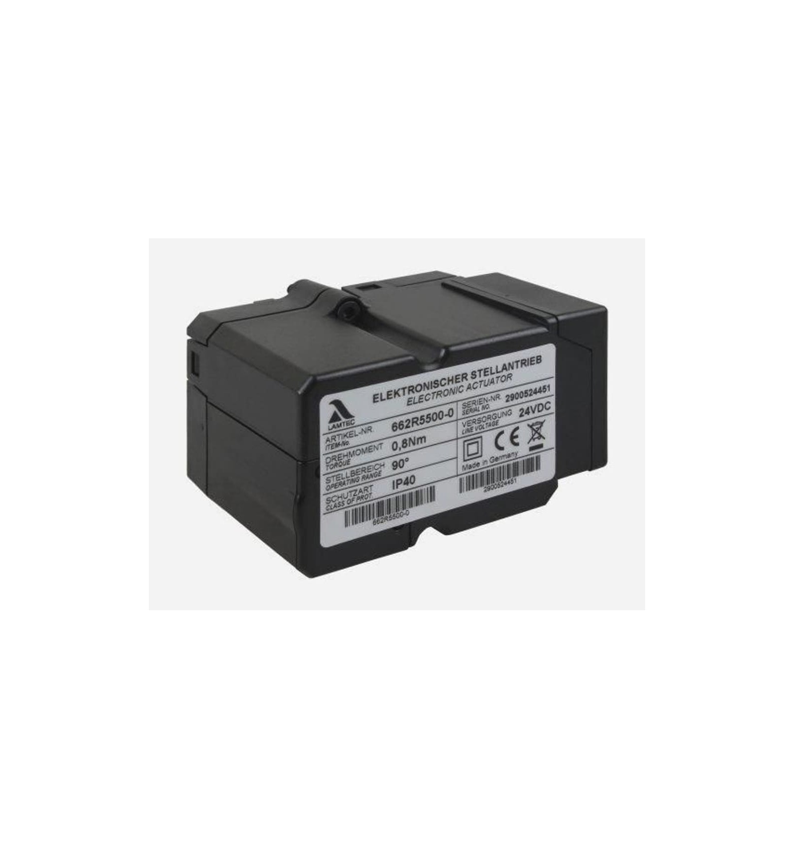Привод 0,8 Нм, класс защиты IP40, температура окружающей среды от -20°C до +60°C, конденсация не допускается, диапазон срабатывания 90°, разрешение 0,1°/шаг, пластмассовый редуктор, по часовой стрелке, без соединительного кабеля.
